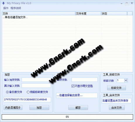 My Privacy File V1.0 简体中文绿色免费版 程序加密内核采用了极其强悍的 1024 位国家级军事加密方案 ,外层用了随机因子混淆和程序内嵌的多层不规则加密,可产生多达 1GB 的无序字节,让非法解密成为不可能,可以媲美同类的任何软件。要想解密除非你同时拥有密匙和加密后生成的证书。输入的密匙采用自变异的多层 MD5 残缺性加密,完全不可逆,完全可以确保密匙的安全。