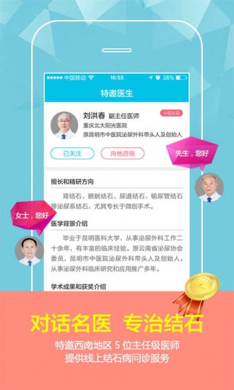 1.专业:西南地区结石病诊疗领域5位主任、教授级专家提供咨询服务,倾力打造国内最全的结石病数据库;2.智能:更方便快捷的在线问诊,提供电话、图文、语音多种咨询方式;