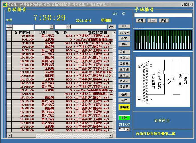 6、高保真的校园广播中心。采用本软件后,不仅可以丢弃原来的打铃器,还可以自动定时播放广播体操、眼保健操等音乐,不再烦劳专人手工播放,无需再占用录音机、VCD等设备,所有音乐保存在硬盘上,免去了在几十张磁带、VCD中翻来找去的烦恼,同时也使恼人的噪音不复存在。就餐、午休等时段可以通过本软件播放校园歌曲。