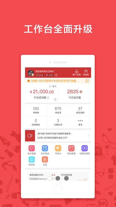 消费者信赖的平台口碑,洋码头就是你生意和品牌的坚实保障。方便快捷的商品发布,每天一场轻松赚钱。自有物流贝海国际速递,后台管理一站式服务,接单、做单、转运、清关全覆盖。