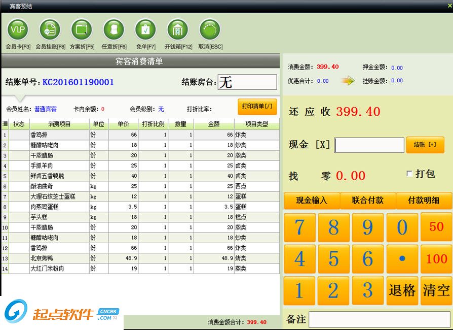 (1) 直接输入宾客支付的现金金额结账,如果宾客同时用储值卡或代金券等其它付款方式结账时,直接点击相应的付款方式按钮即可;