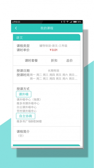 课外喵是一个专注于K12(中小学)教育领域的O2O服务平台,课外喵老师版,是我们为全中国老师量身定制的移动应用。通过它您可以随时随地查看、管理上架课程,与学生、家长实时沟通,便捷管理个人钱包。一张发给千万学生的传单,一个为您带来巨额收益的渠道平台,一个共筑优质课外教育的共同理想,尽在课外喵!【软件特点】