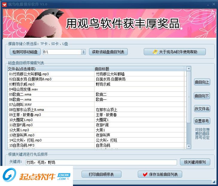 观鸟电媒排序软件专为电媒使用者打造的曲目排序软件,有效解决电媒机播放曲目不准确混乱的问题。支持播放器通用的MP3、WMA、WAV三种格式,清除无效的序号和标题,可根据关键词先后顺序排,指定曲目序号等。