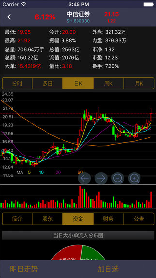 4、支持实时大单净流入、MACD、JDK、EMA、BOLL、SAR、历史数据等的个股浏览系统。K线十字光标实时跟随显示。提供PC电脑端看盘的舒适和全面;
