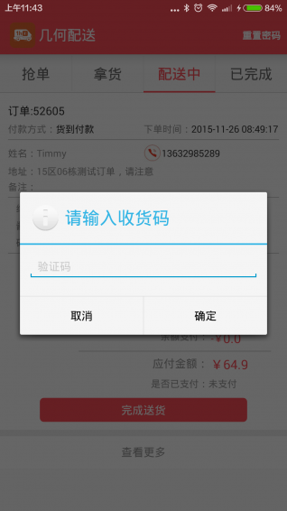 “几何配送“是大型综合社区服务o2o平台“几何社区”推出的移动端专用配送平台,是专职物流合伙人抢单跑腿赚钱的神器。“几何配送”,以社区5公里为生活半径,为用户提供酒水、零食、日化、外卖、水果、蔬菜等生活必需品1小时飞速送达的贴心服务。(目前已开通深圳市)(测试账号19901231122 密码1234567)