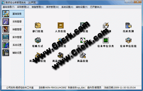 3、基础信息:提供多项最基本的信息设置,包括:地区信息/行业信息/结账方式/仓库信息/出入库类别/客户信息/客户来源信息/客户等级信息/供应商信息/供应商来源信息/供应商等级信息/商品信息/商品分类信息/商品单位信息等。地区信息/行业信息/商品分类信息按树型结构进行分类管理,让您以后可以按大小类进行数据查询分析。在商品信息界面中可以同时录入商品对应的多个供应商与客户,让您随时可以查询出每种商品的详细供应商、客户与每种商品所在详细仓库的数量。