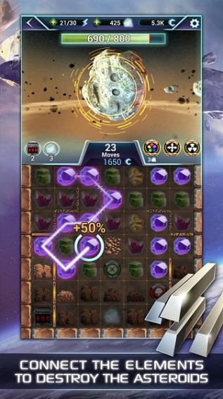 《纪元2205: 小行星矿工(ANNO 2205 Asteroid Miner)》是一款趣味十足的三消游戏,玩家只要在场上布满宝石的地方,将相同宝石连成一线,便能够消除。游戏每一关都设置了不同任务,包括收集特定数量的宝石,击破正在撞过来的陨石等。玩家需要在限定回合数内完成任务,否则便会输掉。玩家在任务中获得的资源能够用来开发太空站,获得特殊能力。