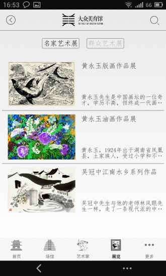 大众美育馆是一款艺术服务软件,可为用户随意浏览各种艺术品,并且有着绘画馆、书法篆刻馆、工艺美术馆、雕塑馆、建筑艺术馆等多个艺术分馆,不管你喜欢什么类型的艺术品都能够在其中找到。