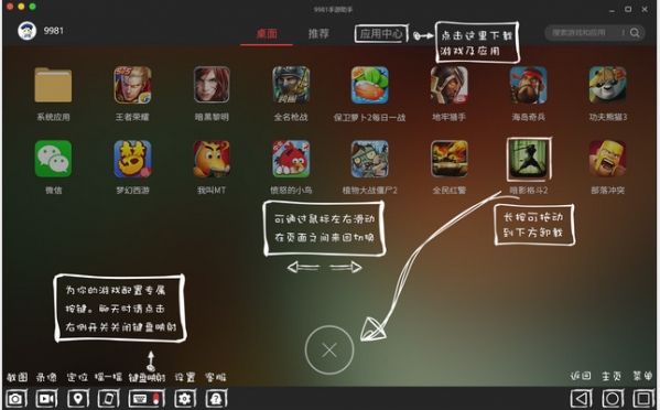 9981手游助手是一款安卓模拟器,9981手游助手利用键盘和鼠标完成Android游戏中触摸屏及重力感应的操控。9981手游助手在电脑上玩Android应用你可以享受到移动设备所没有的优势,最重要的是你不用低着头冒着颈椎劳损的风险以更舒适的姿势来娱乐!