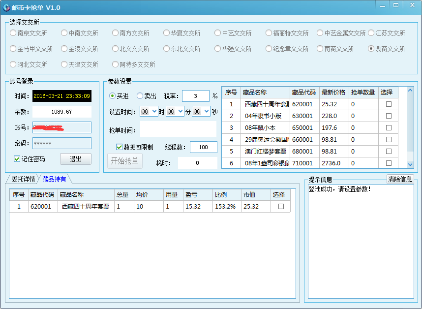 邮币卡抢单软件是一款适用于各大文交所委托的软件。它采用了全自动抢单系统,将账号登陆,即会有相应的余额显示,用户即可根据自己的余额来买进或卖出。