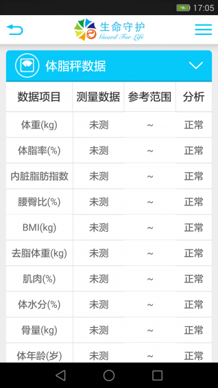 生命守护app是一款生活医疗类软件,该款软件可根据用户的身高、体重、体水分和骨量等数据分析健康状态,并根据每个人的不同健康状况来做出相应的治疗方案,还有最贴心服务,提醒用户每天整点及时用餐。