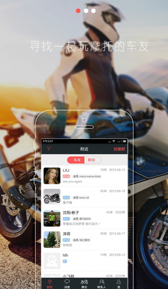 摩友是为喜欢玩摩托车的车友提供的App,App提供了各种需求话题,以主题吧的形式提供给摩托车车友社交,也可以通过地理位置,找到附近一起玩车的人,也可以找到附近玩车的俱乐部,把他们加为好友,或者加入他们,在一起玩车。【更新日志】