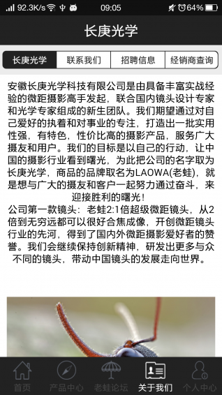 老蛙客户端是安徽长庚光学科技有限公司专为广大摄友和用户推出的满足其摄影爱好和线上购物需求的软件。公司第一款镜头:老蛙2:1倍超级微距镜头,从2倍到无穷远都可以很好合焦成像,开创微距镜头行业的先河,得到了国内外微距摄影爱好者的赞誉。我们会继续保持创新精神,研发出更多与众不同的镜头,带动中国镜头的发展走向世界。