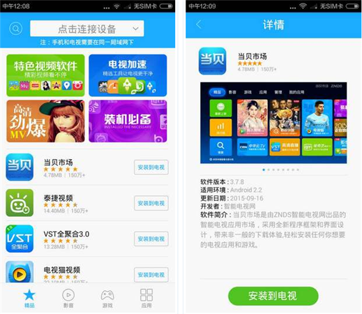 当贝市场手机版,轻轻松松用手机给你的智能电视装应用!1.自动扫描、连接局域网里的智能电视和机顶盒;