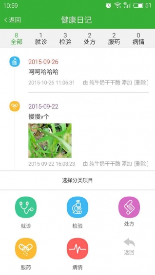 健康日记:个人专属的电子病历单,通过照片、文字记录个人就诊信息,方便医生和自己跟踪健康。