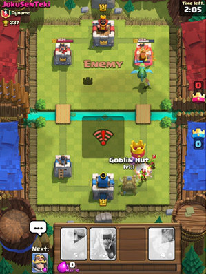 《部落冲突皇室战争》是和《部落冲突》有着相同世界观的即时卡牌对战手游,主要玩法是对线推塔,玩家可以通过卡牌召唤怪物、法术、建筑,攻击对方城堡,直到一方推到另一方的主城堡被毁,便获得胜利,乍一看有点像是曾经的双人小游戏《Castle Raid》的竖版。在《部落冲突皇室战争》中,“紫水”随时间增长,最高可存储10滴紫水,越到后期紫水增长的速度也会越快。不同的怪物、建筑和法术召唤需要花费不同的“紫水”数量。“紫水”有点像是《炉石传说》里的“法力水晶”,数量有限,再加上游戏里可用的手牌最多只有4张卡,所以运气和策略都是很重要的因素。
