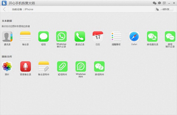 开心手机恢复大师作为一款电脑软件,开心手机恢复大师可完美兼容Windows电脑,开心手机恢复大师提供了特有的三大恢复模式:从设备扫描恢复,从iTunes备份文件恢复,从iCloud备份恢复。开心手机恢复大师是一款专业的苹果手机数据恢复和备份软件,在无需设备越狱的情况下,可以恢复iOS设备iPhone,ipad,iPod touch误删除的通讯录,备忘录,短信,微信聊天记录,通话记录,WhatsApp聊天记录,图片(照片、相册),日历,Safari书签,提醒事项等近16种类型的数据,并支持一键导出数据,达到完美备份重要数据的效果。