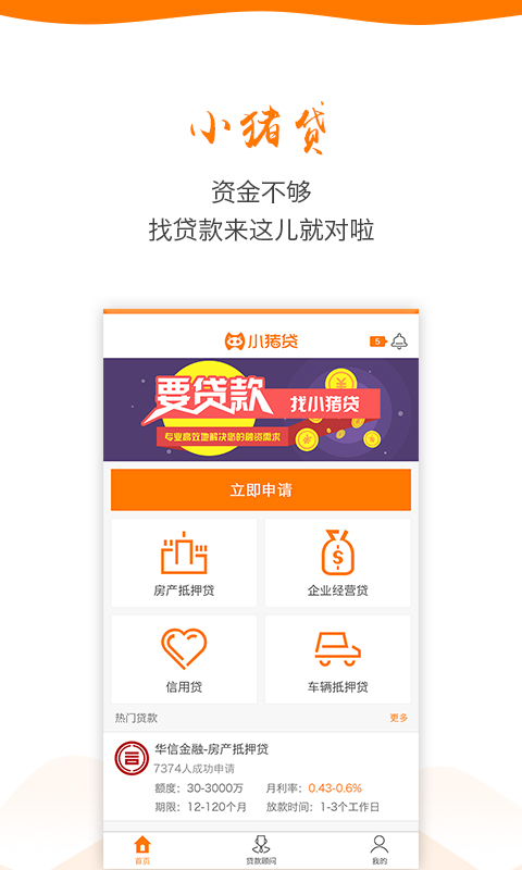 小猪贷app是专为贷款打造的应用,能随时查看各种优质的贷款服务,支持房产和汽车抵押贷款,更有无信用贷款,和多家银行拥有合作,专属顾问为您一对一服务,是您贷款的好帮手。【软件特点】
