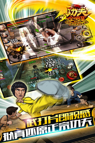 《功夫全明星》是一款超好玩的经典格斗类手机网游,游戏由电影精武门改编而来,以李小龙为主角,游戏中,玩家不仅可以体验到格斗的刺激精彩之处,还能重温原汁原味的影视剧情,游戏呈现出超快感的无限战斗和超强的打击感,更充分采用最先进的强化声光效果与操作流畅度核心技术,将给玩家带来超华丽战斗画面和最顶尖视觉效果。同时拥有李小龙、李连杰、甄子丹等强势明星IP配合,游戏中还有截拳道、迷踪拳、咏春拳等武学功夫,更有黄飞鸿、陈真、霍元甲、叶师傅、严咏春等知名武师。游戏采用超高核心技术模拟场景,独特的浓墨重彩画风,穿梭各个时代的经典场景,让你身历其境!九龙街、佛山宝芝林、虹口道馆、美国唐人街等历代武林高手决战之地都将在游戏中重现!