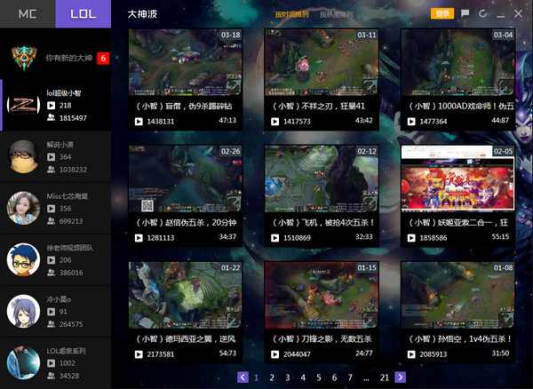 大神波可以直接订阅观看各种游戏大神视频,第一时间收到视频更新提醒,包括有《我的世界》的籽岷,悠然小天,《英雄联盟LOL》的小智,若风,《魔兽争霸war3》的xiaoy,邪恶的小调,《穿越火线》的CH明明,奇怪君,还有《GTA5》《地下城与勇士》《dota》《炉石传说》《星际争霸》《地下城与勇士dnf》等各种单机游戏,网络游戏的视频。最重要的是:可以在留言区抢前排