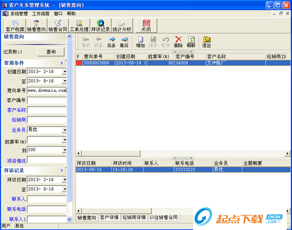 客户档案:方便快速的客户资料录入与检索,检索分为模糊和精确等多种模式销售意向:意向客户的销售机会稍纵即逝,销售意向清淅记录客户的潜在需求