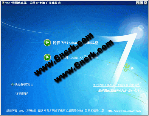 一键将你的XP桌面主题转换成为Windows 7的超炫样式。本程序可以将XP的各种界面元素,如窗口外观,开始菜单,系统图标,鼠标指针,系统声音,登陆画面以及桌面壁纸完全改变成为Windows 7的风格,让您在XP下也能轻松享受Windows 7的超炫界面! 本程序采用国内最强大的桌面主题美化软件“XP变脸王”的引擎,不驻留内存,不影响系统速度,并且全部使用Windows提供的标准接口方式更换界面,不直接修改任何系统资源文件,保证安全。本软件还附带了“半透明窗口”和“超级任务栏”程序,让Win7模拟更加逼真!本程序的还原功能也可以让你轻松将界面恢复为XP风格。想体验Win7桌面的感觉吗?赶快下载Win7界面仿真器吧!