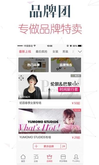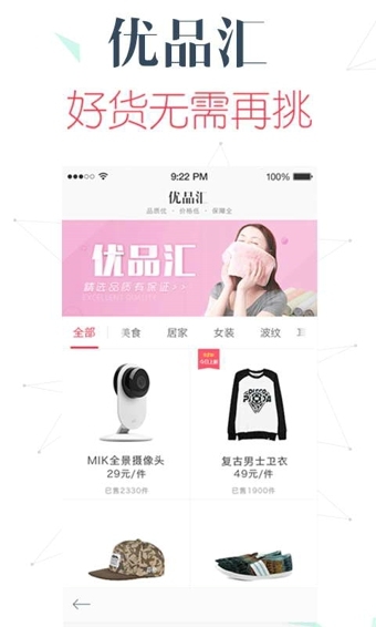 1、劲爆促销:限量抢购、2件8折、9块9包邮、新人专享、优惠券等,优惠多多2、特色频道:品牌团、优品汇、0元抽奖等,无限精彩