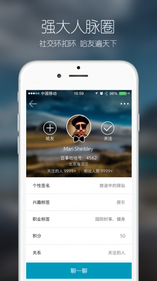 中国首家需求响应社交平台,真人互动,随时满足你生活各种需求。您的生活圈、工作圈、朋友圈圈圈相扣,商家的生意圈、客户圈、供应圈环环相连。您生活和工作的线上居所,展示和交友的虚拟沙龙,商家联系客户的直达宽带,兄弟意气相投的网络梁山,汇聚大量商家和个人信息,覆盖全国所有大中小城市,包括餐饮、旅游、物流、农业等19个类目。真实,及时,精准,有趣,随时随地,有求必应,让你的生活更轻松。【软件特色】