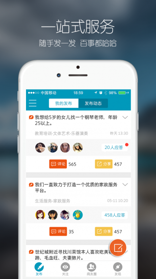 即时获取精准信息--无需等待,无需海量搜索,发出需求就有人精准回复。满足生活各种需求--涵盖工作、生活方方面面,19类生活信息,只有想不到,没有找不到。