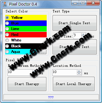 Pixel Doctor V0.4 英文绿色免费版 Pixel Doctor是一个简单易用的液晶显示器坏点检测程序,可用于修复LCD上的坏点。修复液晶坏点并非不可能,已有一些通过颜色切换来实现唤醒“死去”坏点的例子。需要注意的是,液晶坏点的成因比较复杂,物理缺陷是很难修复的,因此不可能100%管用,仅供测试。
