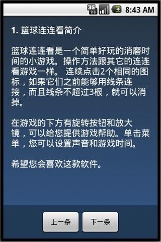 篮球连连看是一个简单好玩的消磨时间的小游戏。操作方法跟其它的连连看游戏一样。 连续点击2个相同的图标,如果它们之前能够用线条连接,而且线条不超过3根,就可以消掉。 在游戏的下方有旋转按钮和放大镜,可以给您提供游戏帮助。单击菜单,您可以设置声音和游戏时间。 希望您会喜欢这款软件。