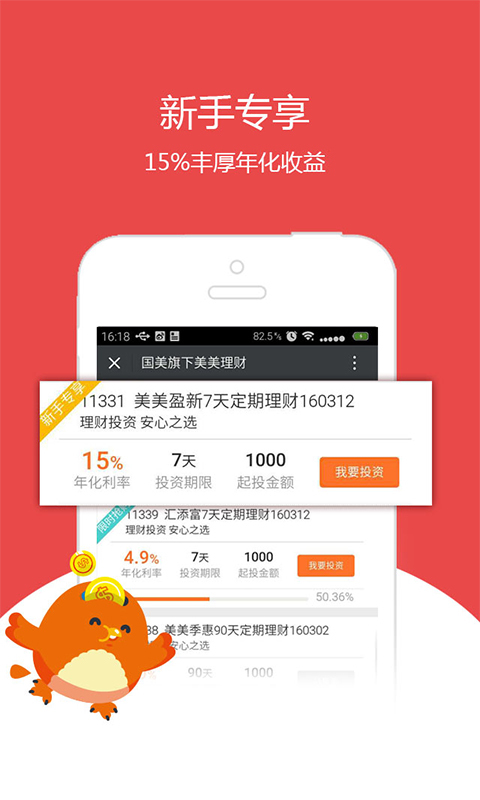 美美理财app是一款投资理财应用,美美理财app为用户提供一个安全稳定的投资平台,让用户可以自由选择合适的理财产品,体验高收益低门槛的理财服务。【更新日志】