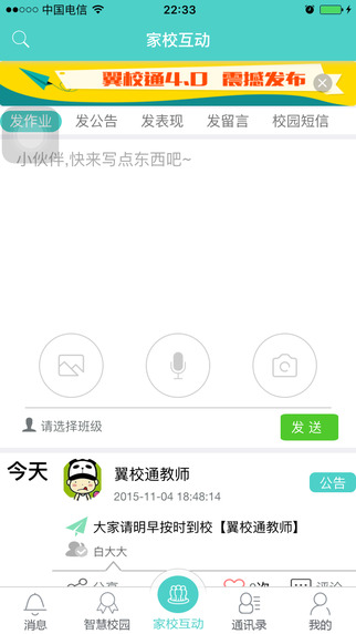 翼校通乐智版是为学校与家长沟通搭建的良好桥梁,它面向广大中小学教师、家长和学生,为学生提供作业、辅导上的便利,也为老师和家长提供相互沟通的机会。