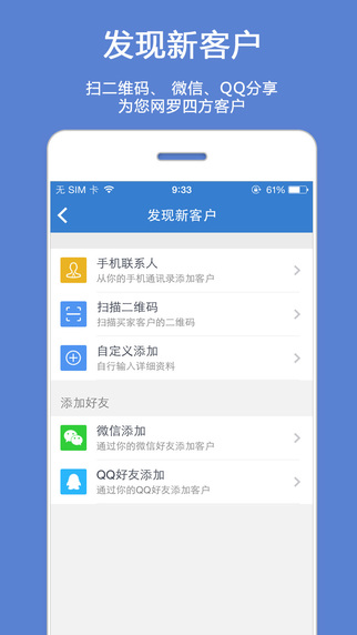 便捷的客户管理方式,支持添加微信、QQ好友成为客户,轻松拓宽店铺客源;