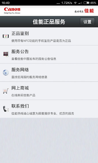 佳能正品服务app为了打击非正品,保障用户的权益,佳能(中国)导入了新型RFID(无线射频识别)防伪技术,通过带有NFC(近距离无线通讯技术)功能的手机与防伪标签进行通讯,系统自动鉴别该产品是否为佳能(中国)正品。【使用方法】