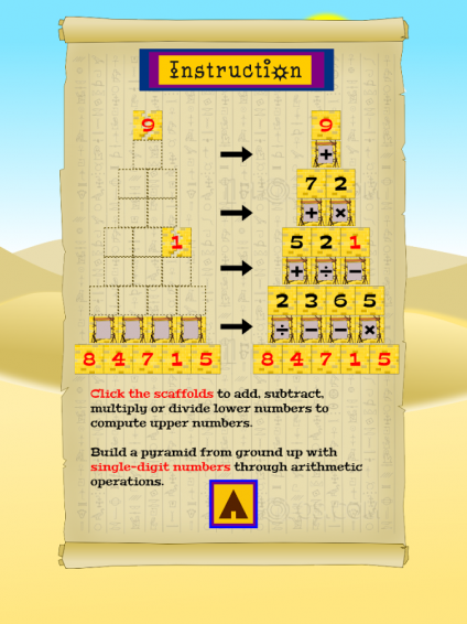 《数字法老 Number Pharaoh》是一款休闲游戏,古埃及的法老正在监督人们建造金字塔,使用加减乘除进行运算,创造更高一层的金子塔,最终得到金字塔顶端的数字即可获胜。