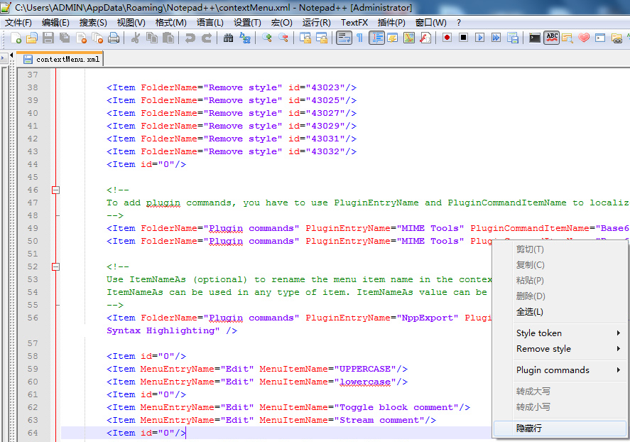 安装TextFX插件(一般为默认安装)后,会出现TextFX菜单项,选择相应的子菜单,可以实现删除程序空行、为代码增加行号、删除程序行号或首字 、整理xml文本格式、去掉文本中的HTML元素、转换为HTML实体等