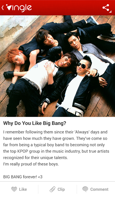 在Vingle,你可以成为真正的自己并且只接收你想要看到的信息。不用担心私生活被监视,或被强迫接收烦人的商业广告。高质量的文字和视觉信息不仅可以让时间飞逝,而且可以让你在兴趣领域变得更加专业。你也可以尽情地与“懂你的”人们分享你发布的内容。