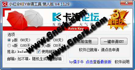 小红伞KEY申请工具懒人版 V5 0403 简体中文绿色免费版 这个小工具可以申请P版/S版/大P版/大S版key,不需要填姓名,地址,电话等等,只需要点2下鼠标,简简单单,KEY就到手了,完全为懒人设计,大家看图。