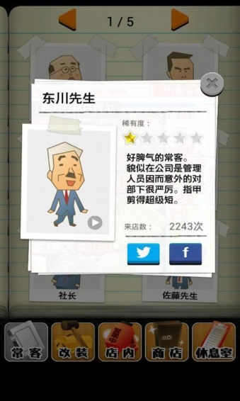 今晚也在那里的酒馆里、爱情故事再次开花…在居酒屋的舞台上、收集大叔的放置系登场!「我、有了喜欢的人」游戏操作简单。经过一定时间后对积攒起来的大叔们点击并滑动、就会获得营业额。积攒好一定的资金、就能开发新的菜单、变更服装、对店面进行改造!收集吧:大叔酒馆是一款日系风格的模拟类经营手机游戏,游戏中你将萌萌哒的大叔一起经营这家酒馆,你要将这家酒馆经营起来并且发扬光大哦!