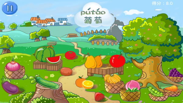 开始游戏,在游戏界面会看到15种日常生活中常见的水果蔬菜,游戏会随机出一个让孩子选择的水果蔬菜,并且伴有音效,玩家然后点击正确的水果蔬菜即得2分,答错不扣分。玩家可以通过左上角的设置按钮来调节背景音乐和音效。