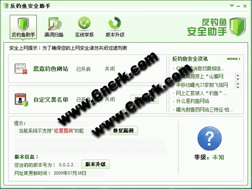 反钓鱼安全助手是一款屏蔽钓鱼、违禁、不良网站的计算机终端安全软件。包含过滤钓鱼网站、过滤违禁信息、系统漏洞修复三大核心防护功能,有效防止网游、网银账户失窃、个人隐私被盗等多重风险,是网民享受绿色纯净上网环境的必备软件。