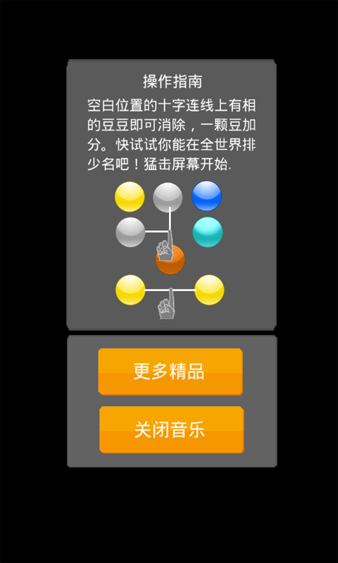 经典打豆豆是一款休闲好玩的游戏,点击一个可以把两个相同的痘痘连城直线或者直角的空格,即可消除掉两颗痘痘,一颗豆加一分。吃饭睡觉打豆豆,感兴趣的快来试试吧。