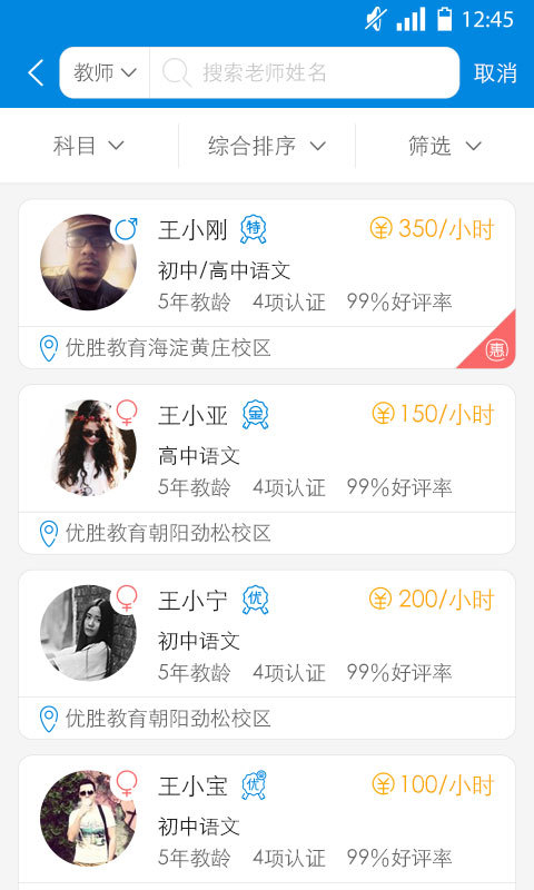 本平台是优胜(中国)教育集团专门针对小初高学生如何快速、高效提分而推出的一款app。在这款app上,你可在线查看教师资料、各学科分类、课程价格等,你可以根据自己所在的城市和区域,就近选择教师上门或到店两种上课方式;若有突发情况不能上课可随时在线和老师沟通,另约辅导时间;学生也可以对教师的教学能力和方式进行课后评价。学习其实很简单,只不过你没有找到对的方法。选择优胜教育,让提分更简单。【更新日志】