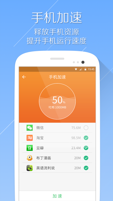 全方位扫描手机,轻松清理无用应用,做到真正的一键清理。欢迎与猎豹清理大师、鲁大师、手机加速器、LBE安全大师、WIFI万能钥匙做比较。批量删除无用应用,为手机瘦身!