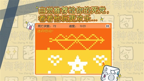 有种你别死破解版是一款由坑爹团队打造的虐心闯关手游,这款游戏非常考验玩家的反应能力,操作能力和思维能力,在游戏中玩家需要控制方块不断跳跃直到终点,沿途有各种看得见看不见的障碍物,到达终点的路程虽短,但是困难重重过关不易。
