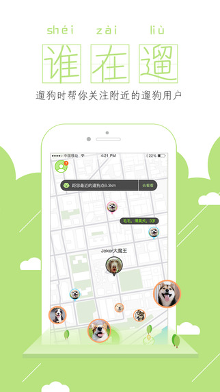 附近狗狗:实时显示附近正在遛的狗狗,帮您的狗狗找到合适的小伙伴。