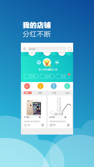 4、店铺:我的店铺里,可上架商品,参与团购,装修店铺,给我留言,一键互动交友,还可以在这里直接给商品调价。