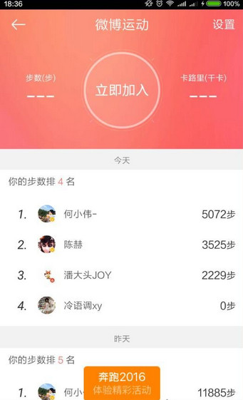 6、微博运动还有“活动任务”版块,通过“活动任务”,用户可参与明星和团体发起的健身活动。