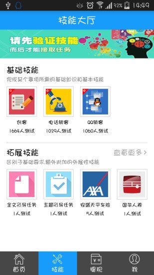 1、技能板块罗列了所有的技能类别,用户可以点击各个技能进行测试认证。通过技能测试方可接取任务;2、提现板块用户可以随时提交提现申请,我司客服人员审核时候即可发放;